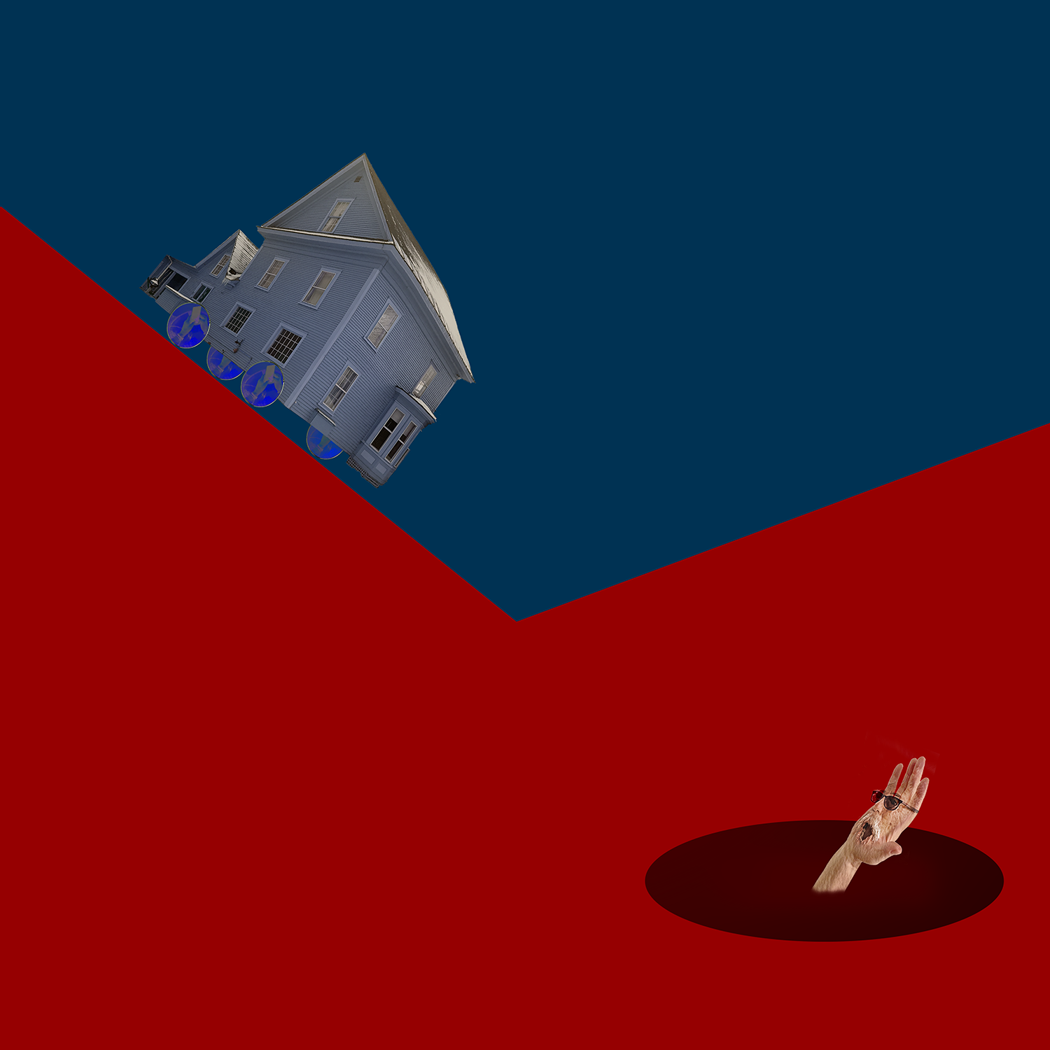 A house tilts away from certainty, its foundations no longer aligned with gravity or reason. Below, a single hand rises from the void—not grasping, not pleading, but signaling awareness at the moment structure fails. This is not catastrophe alone, but recognition: that what we build to shelter us can also carry us toward collapse. Between the falling home and the emerging hand lies the fragile interval where consciousness awakens—not to save the form, but to witness the descent.