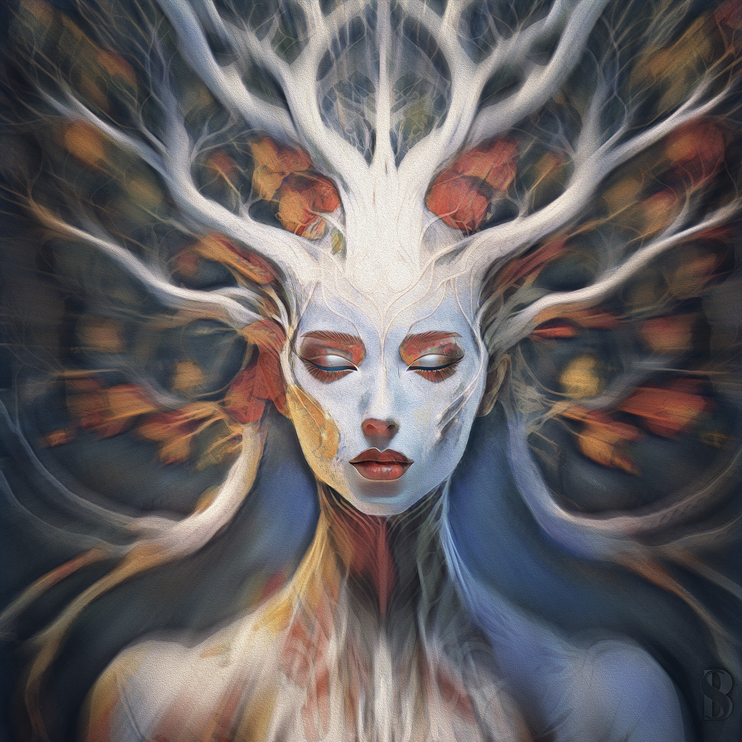 Her eyes are closed, not in sleep, but in listening. Branches rise from her crown like ancestral pathways, carrying the memory of wind, soil, fire, and time. She is not separate from the forest—she is its inward face, the moment matter turns reflective. Veins echo roots, breath mirrors seasons, and identity dissolves into continuity. This is not a portrait of becoming, but of remembering: that what we call self has always been the world, paused long enough to know itself.